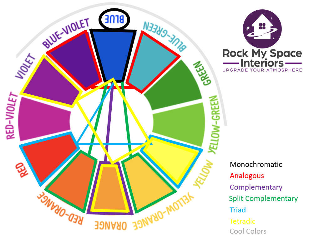 As explained in our color wheel guide, the following color palettes are recommended for blue spaces (including varying shades, hues, chroma, & neutrals):