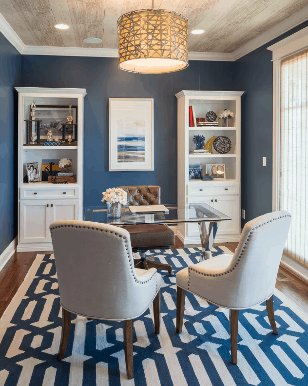 Home Office - You can’t go wrong with using blue in your home office. Light blue will help calm & relax your mind so you don’t stress out; medium blue will stimulate productivity; bright blue will energize your space; and dark blue will make it feel formal and professional.